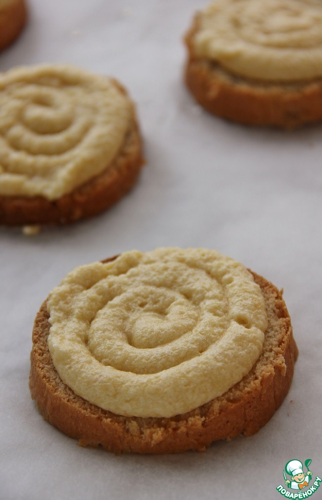 Смоченной стороной выложить на противень, затем с помощью кондитерского мешка нанести крем.