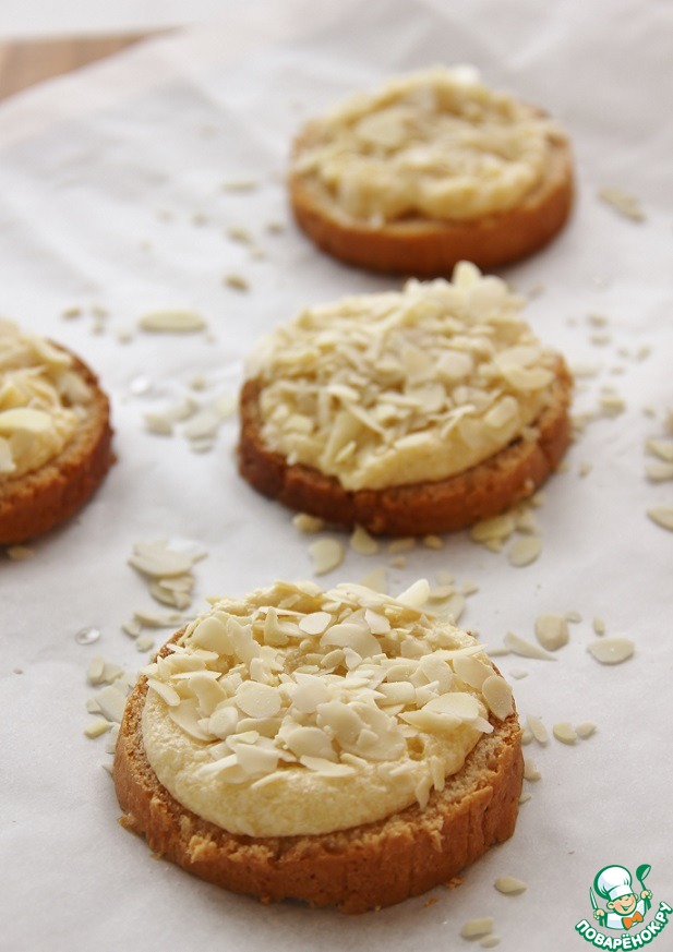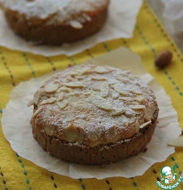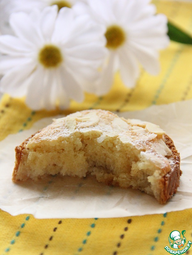 Посыпать миндальными лепестками. И запечь, в предварительно разогретой до 180 гр. духовке, в течении 15 мин. Возможно вам понадобиться меньше времени, надо чтобы просто зарумянилось.