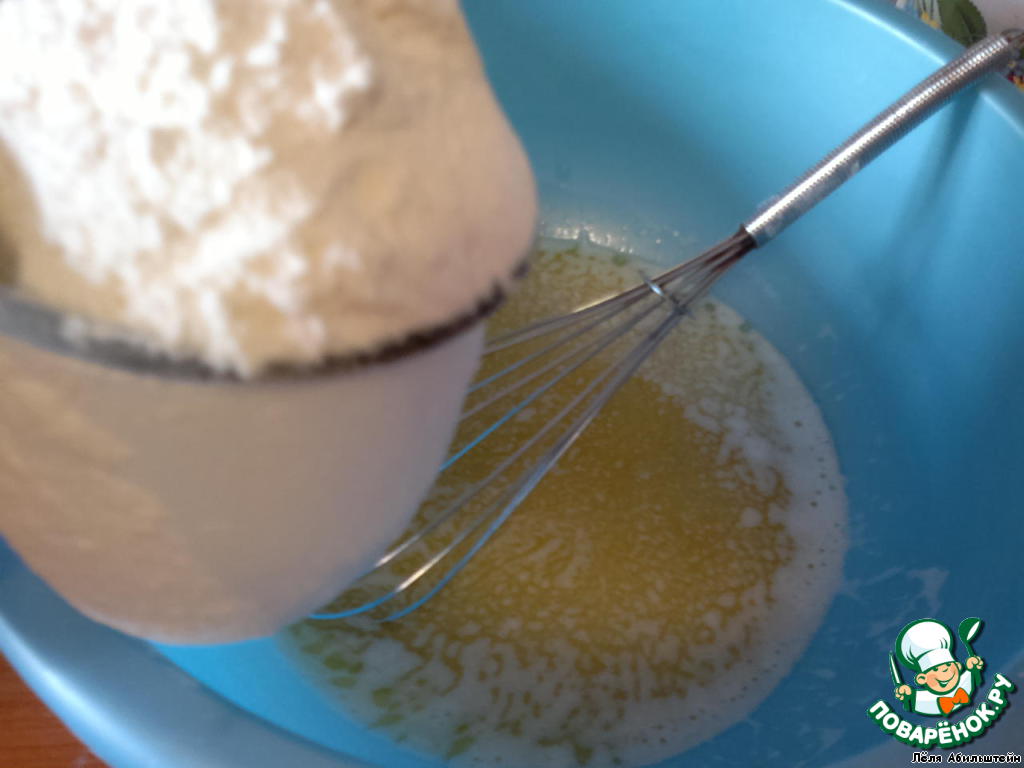 выливаем растопленное масло и добавляем муку. Замешиваем тесто.
