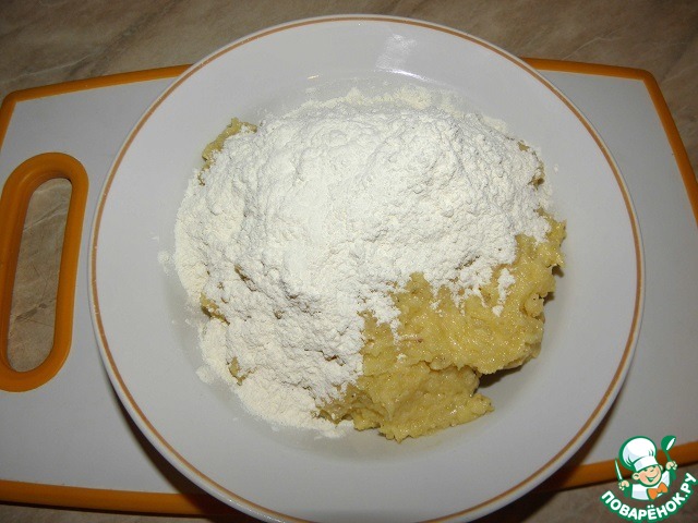 Муку просеять через сито, и перемешать с содой. Постепенно добавить в картофельную массу. все хорошо перемешать.