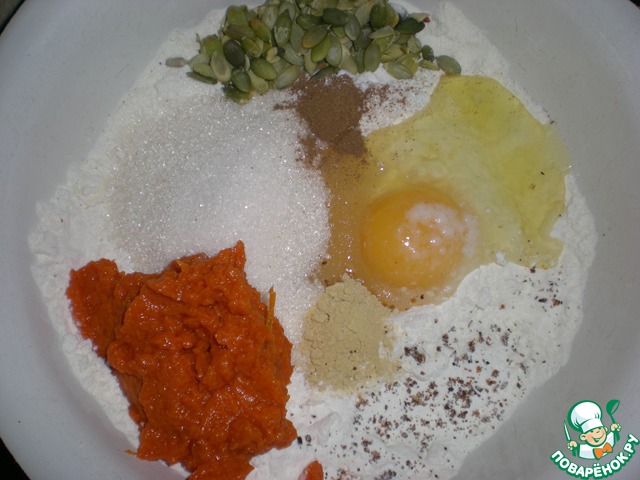 Добавить разрыхлитель, яйцо, тыквенное пюре, тыквенные семечки, сахар, соль, специи, ванильный сахар. Кардамон измельчить в ступке. И все хорошо перемешать.
