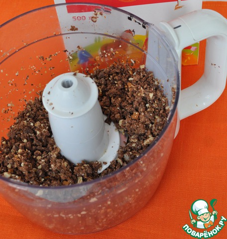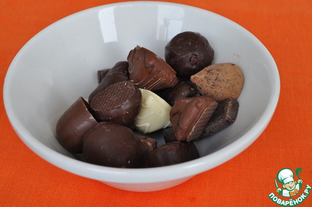 Конфеты измельчить в блендере (грильяж и другие жесткие начинки не стоит брать, можно повредить блендер).
