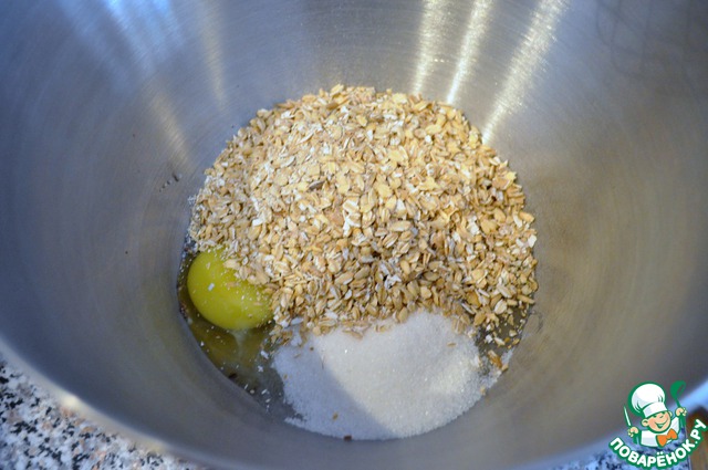 Выложить в миску соль, сахар, яйцо, хлопья и перемешать.