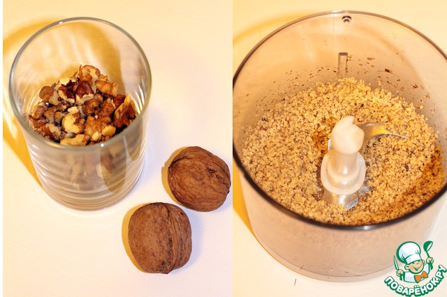 Ну а теперь сам рецепт! Нам понадобятся 100гр. грецких орехов, которые мы измельчаем в блендере.