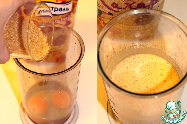Яйца взбиваем с сахаром до тех пор, пока сахар не растворится. Я люблю коричневый крупный сахар, он придает блюду отличный вкус.