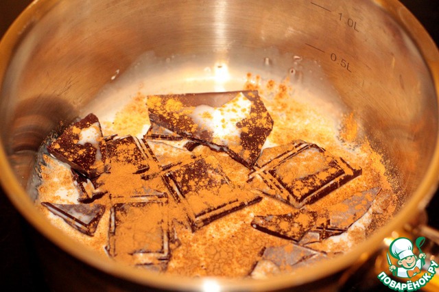 Дальше можно смело отступать от рецепта и, достав маффины из духовки, отправиться по делам или спать, но если у вас есть еще немного времени, то можно приготовить шоколадные украшения. Для этого в кастрюле соединяем 10гр. сливок, 50 гр. шоколада и корицу. Все нагреваем и размешиваем до однородного состояния.
