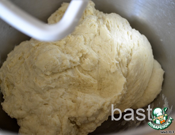 Замесить мягкое, эластичное тесто. Накрыть и поставить в тёплое место на 60 мин.