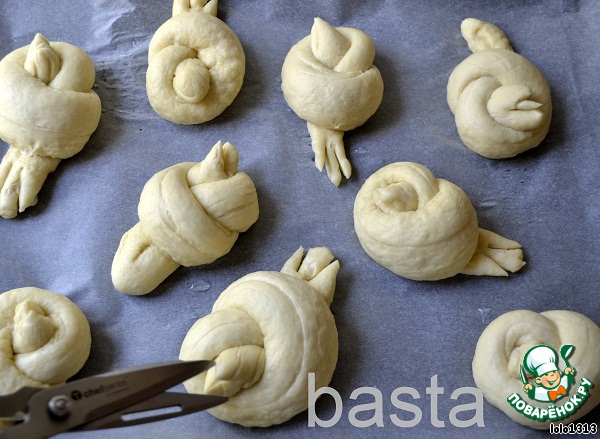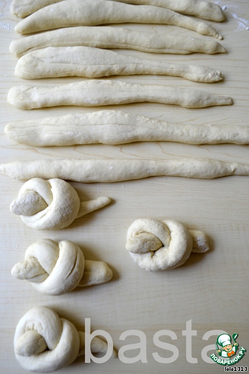 Из каждого куска теста скатать жгут,один конец которого будет чуть толще другого.