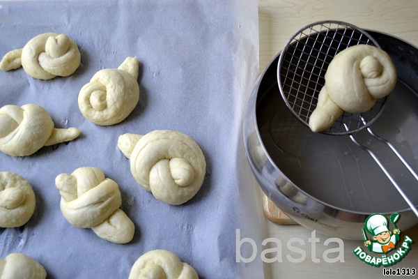 Воду довести до кипения и добавить соду. Температуру сбавить и осторожно отпускать в горячую лауге(содовый раствор) по одному кренделю. Он должен находится в растворе 30-60 секунд.