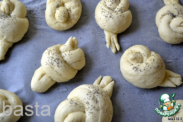Вытащить брецель большой шумовкой ( только не алюминиевой ) и разложить на противень, застеленный бумагой для выпечки (лучше всего брать не бумажную , а многоразовую которую можно мыть или силиконовый коврик, а то брецели к бумаге прелипнуть могут), или же смазать противень маргарином. Сверху брецель слегка разрезать и теперь можно посыпать крупной солью, или сезамом, или маком, или же тёртым сыром.