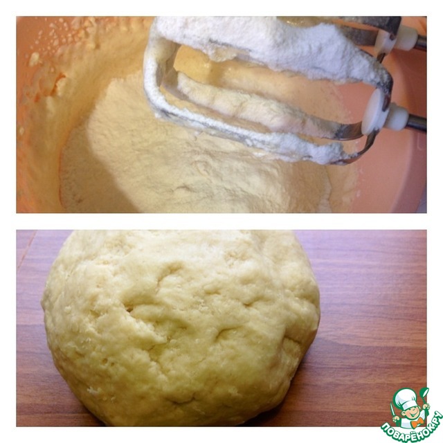 Добавить разрыхлитель и часть муки, взбить. Затем постепенно добавляем муку и руками вымешиваем эластичное тесто. Не забиваем его мукой.