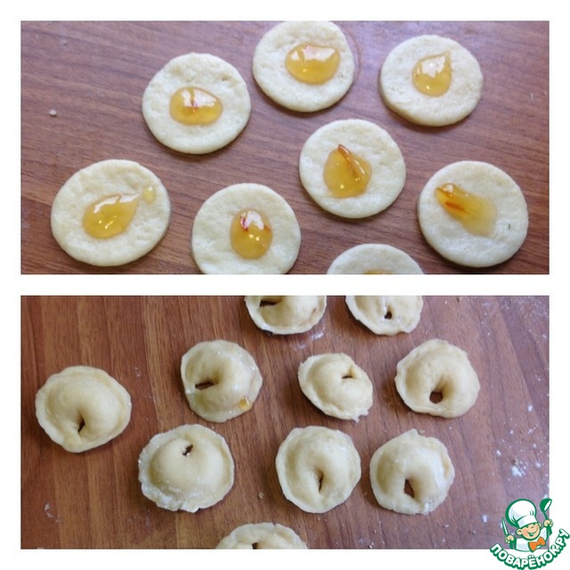 Присыпаем стол мукой совсем чуть чуть и тесто раскатываем достаточно тонко, как на пельмени. Стаканчиком вырезаем кружочки и в центр выкладываем джем. Форму придает пельменя. Ставим выпекать в разогретую духовку на 10 мин при 180 гр. Я использовала силиконовый коврик, поэтому противень маслом не смазывала