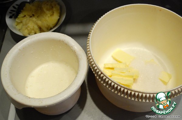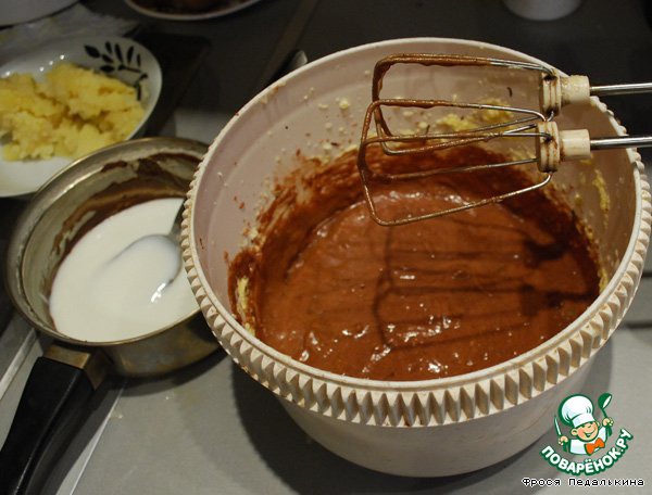 К смеси добавить картофельное пюре (без комочков!), шоколад, мускатный орех и корицу, хорошо размешать.
