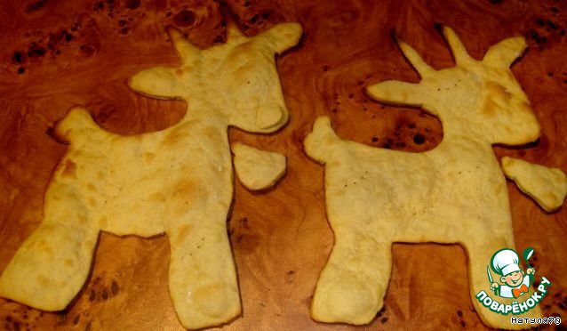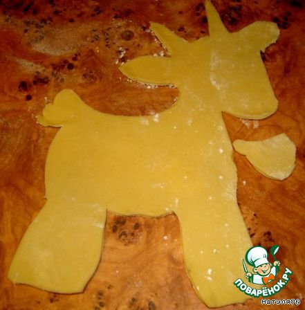 Из каждой части вырезаем будущую козочку и колокольчик. Убираем в разогретую духовку на 20 минут.