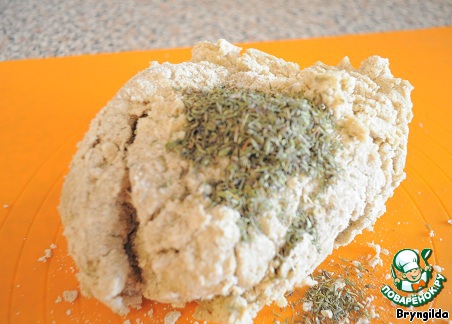 Постепенно добавить воду, масло и горчицу и в конце гашеную соду и замесить тесто, добавить чабрец.
