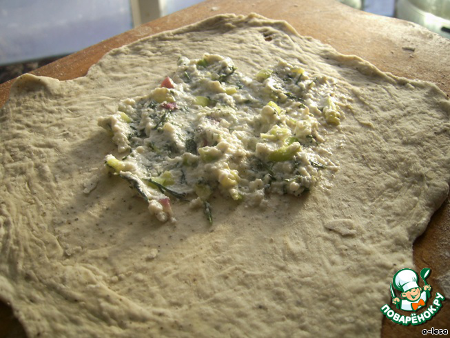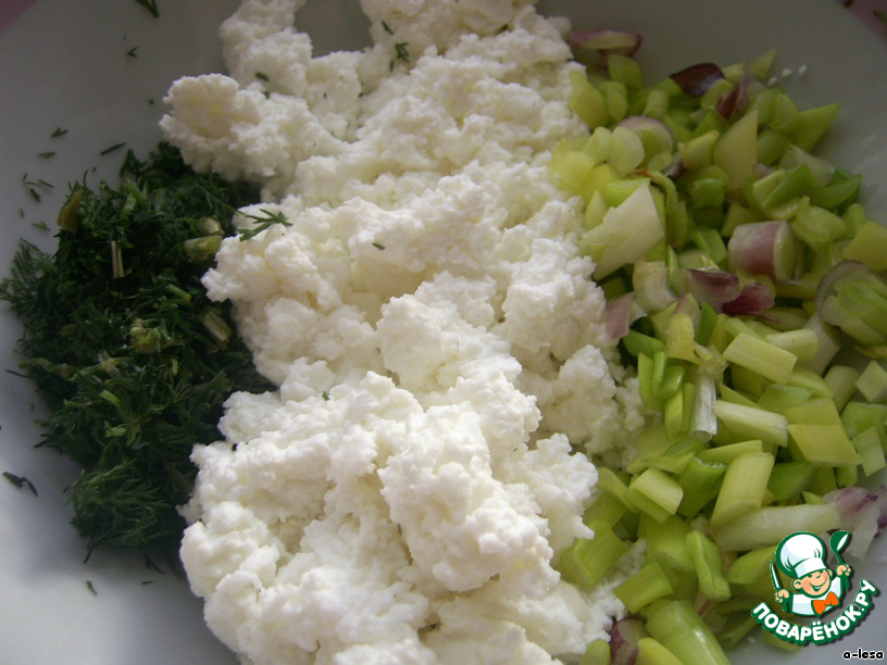 Творог смешать с укропом (можно конечно добавить любую другую зелень) + лук + молоко (для сочности начинки)