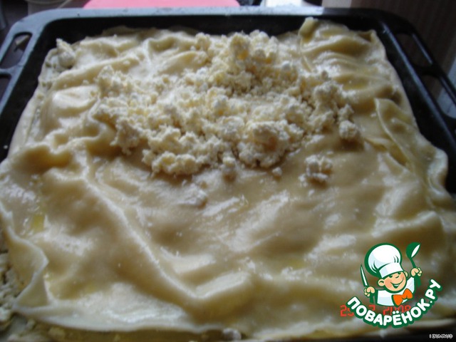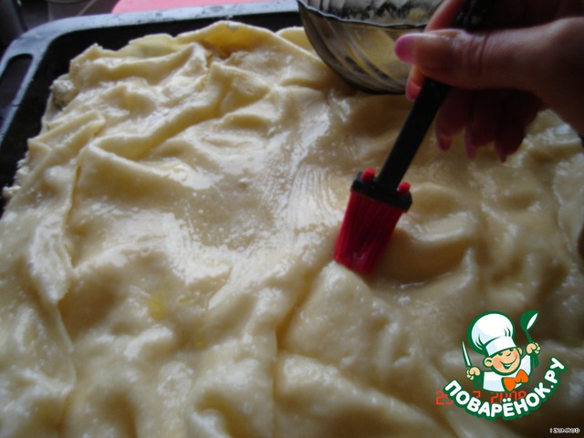 противень смазали маслом и выложили первый слой теста (СЫРОЙ)