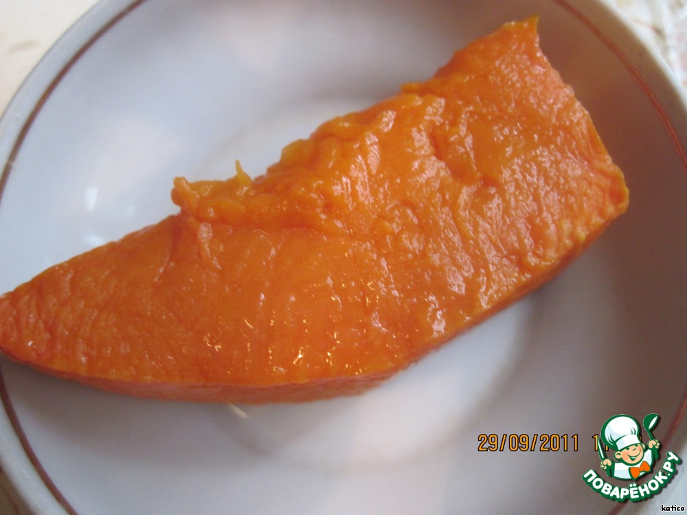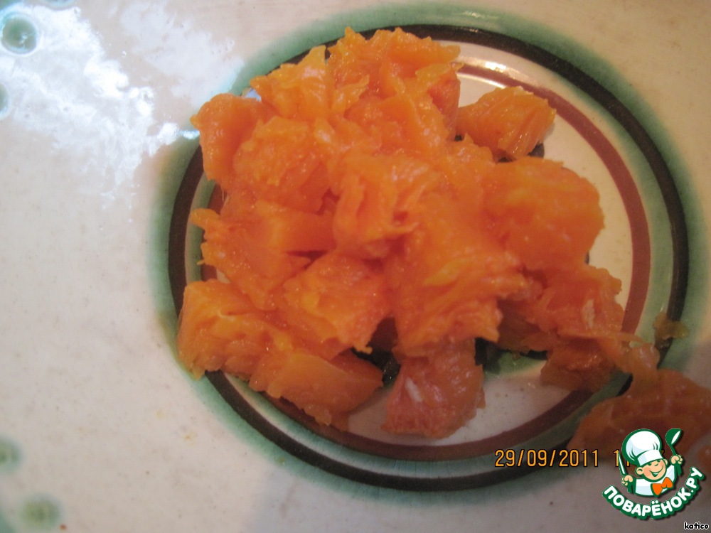 Запечь, остудить и пюрировать тыкву, оставить маленький кусочек тыквы (50-70 г), он нам понадобится для салата.