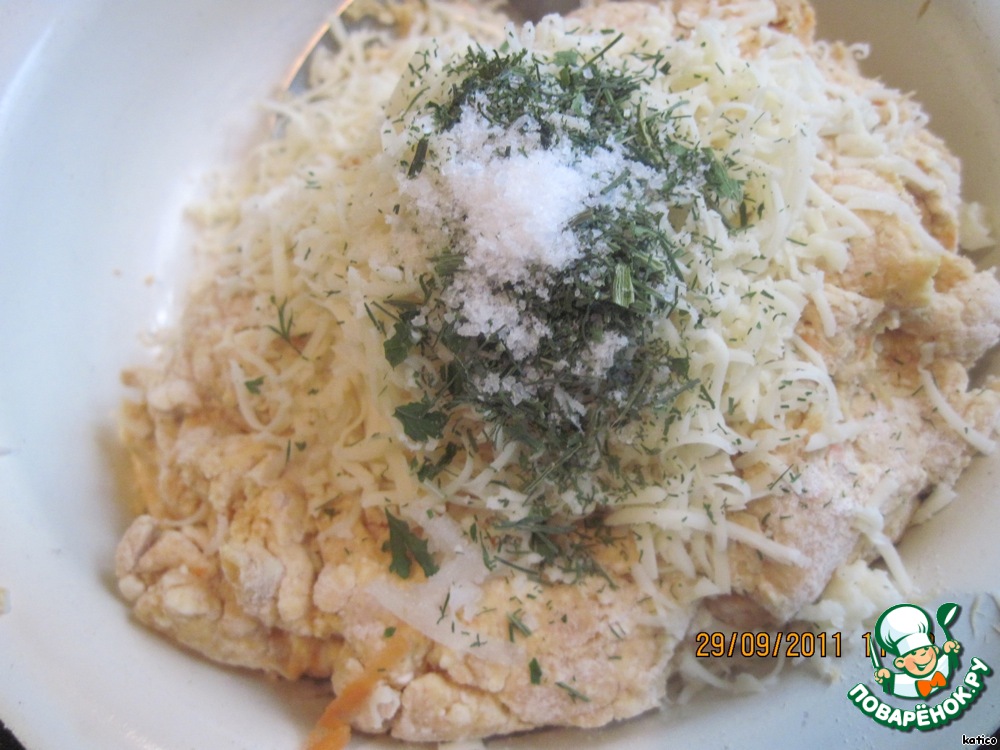 К тесту добавить тертый сыр, сухую зелень, соль, перец,