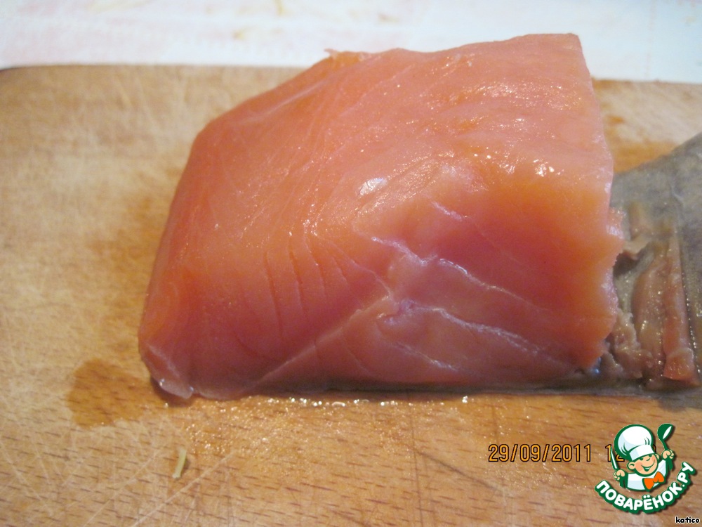 Слабосоленый лосось (или другую красную рыбу) тоже порезать мелким кубиком, добавить к овощам, размешать.