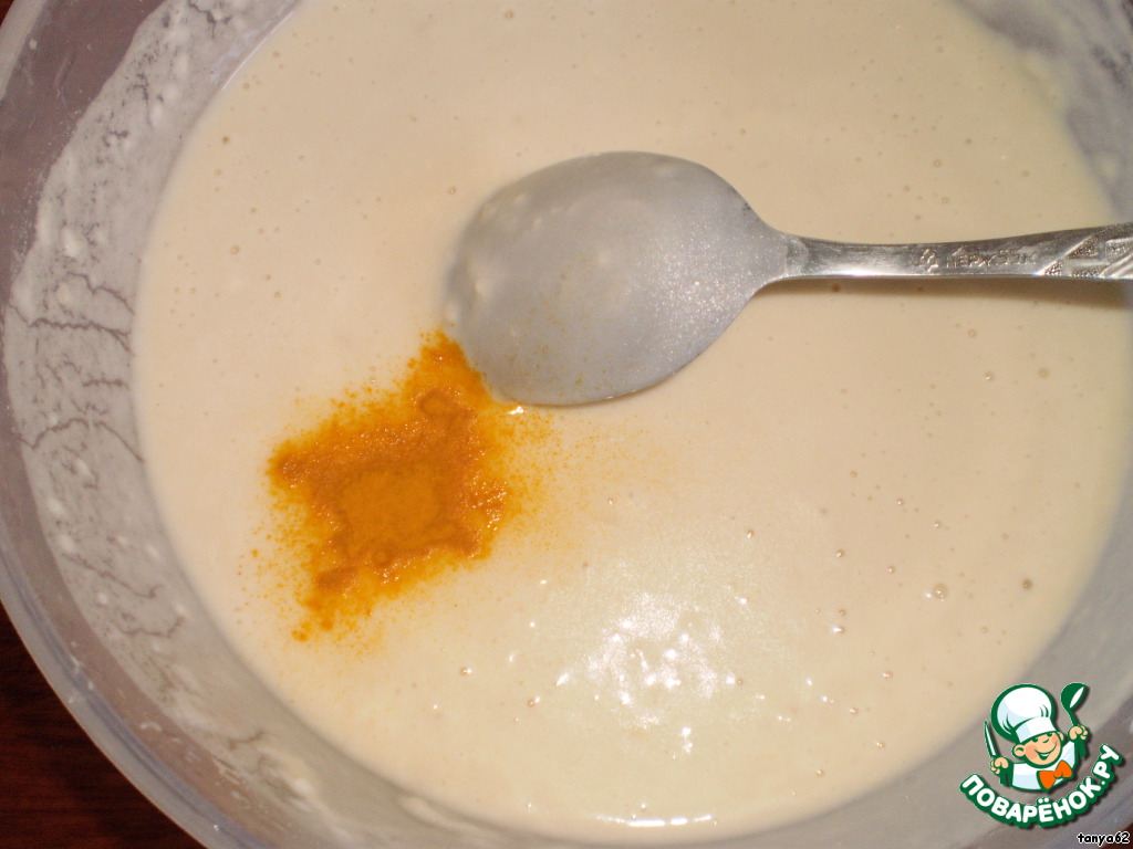 Приготовить кляр. В миску положить стакан муки, сахар, растительное масло, соль. Влить стакан сладкой газированной воды и хорошо перемешать, чтобы не было крупинок. Добавить куркуму для цвета.