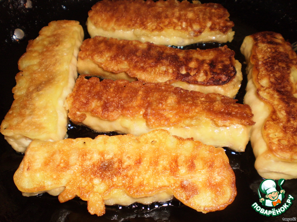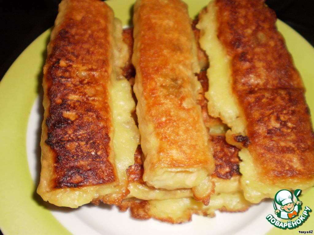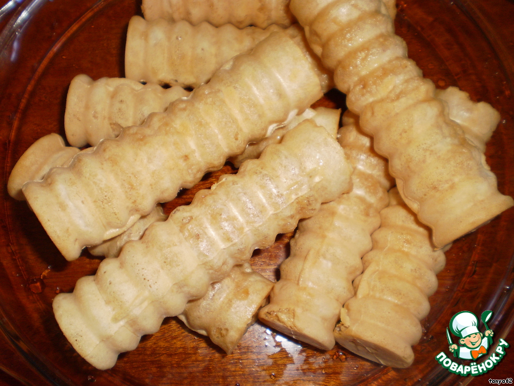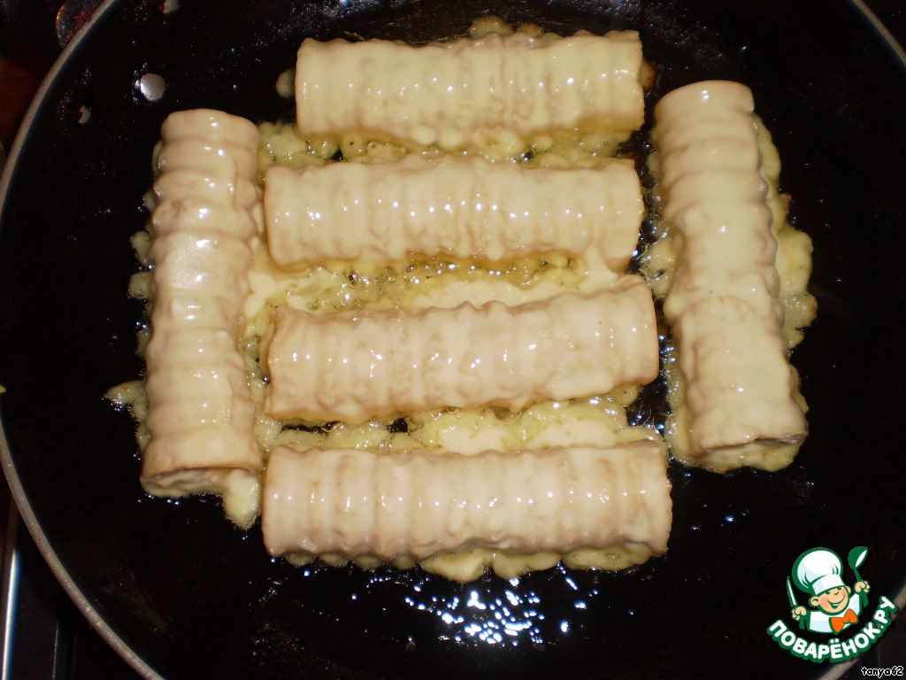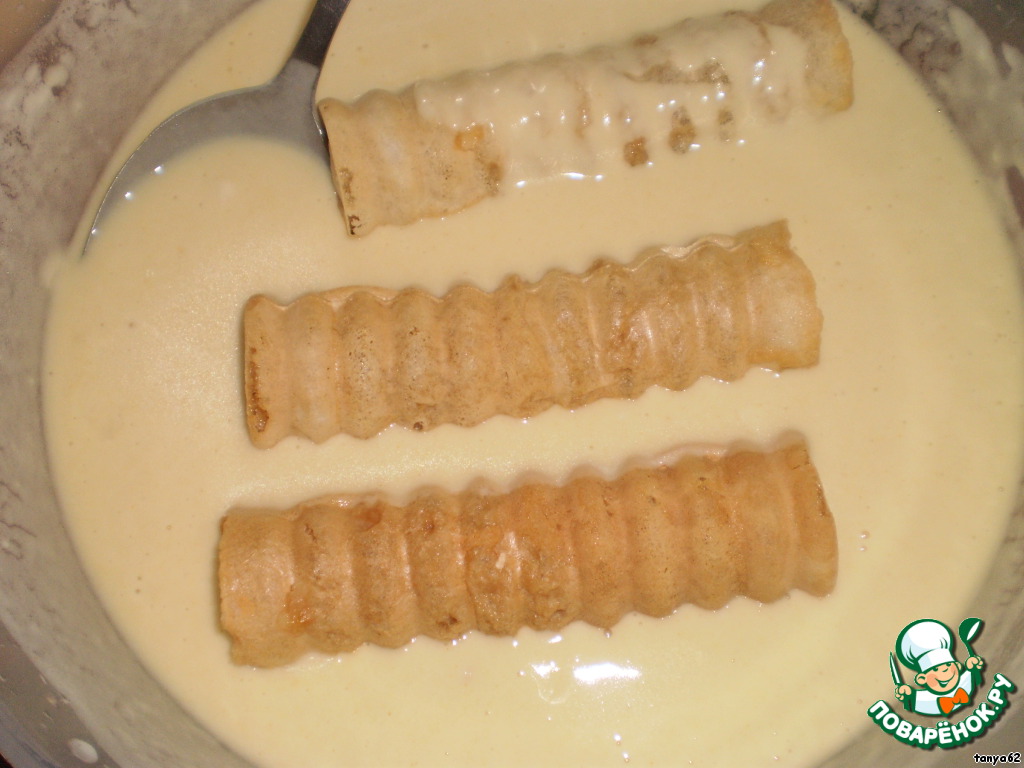 Начинить вафельные трубочки начинкой. Сразу все не начинять, на одну сковородку сначала, потом на другую. Они очень быстро намокают, и трудно будет окунать их в кляр.