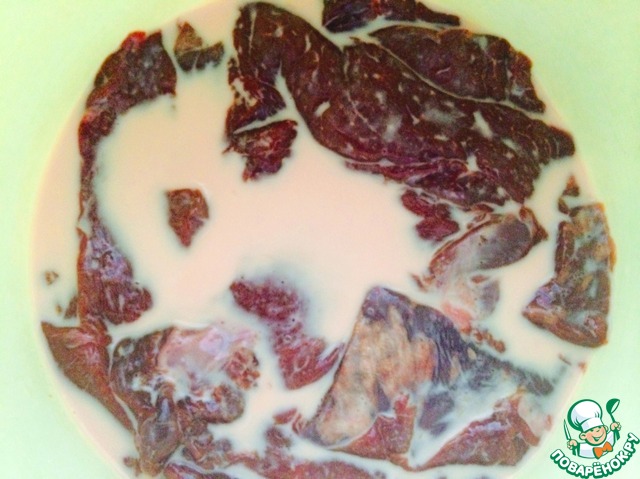 Тем временем печень залить молоком, соевым соусом, можно также добавить чайную ложку сахара. Эти маневры снимут горечь у печени (особенно если печень свиная или говяжья)