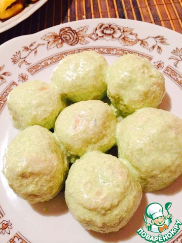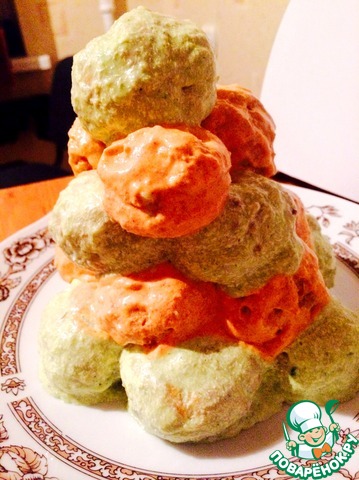 Обмакиваем со всех сторон профитроли в соусе. Те, что со свининой - зеленые, с печенью - красные. Начинаем выкладывать горкой на блюдо.