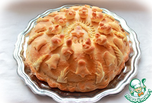 Весь курник украшаем фигурками из теста. Фигурки вырезаем из того же теста, формочками и ножом и что-то формируем вручную. и приклеиваем на молоко на курник.