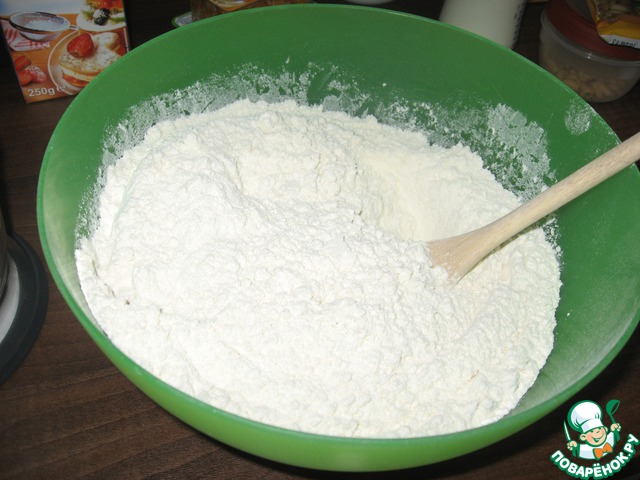 Смешаем сухие продукты: муку, сухие дрожжи, сахар и соль.