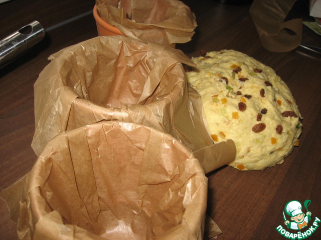 И тщательно вмешаем начинку в тесто. Делать это довольно-таки легко. Тесто мягкое и податливое. Далее берем горшочки деаметром 10 см и прокладываем их пекарской бумагой.