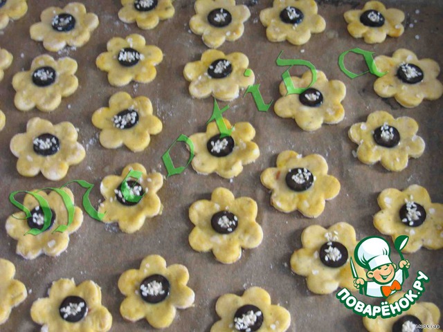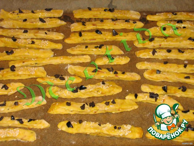 | нежные солененькие.. сырные... с ароматными специями... оливками и кунжутом цветочки... очень вкусно с пивом........ а можно и с чаечком.. кто как больше любит.. детишкам нравится просто так грызть цветочки как орешки... очень просто готовить и очень быстро есть... а если возиться с цветочками не хочется, то можно сделать палочки :) |