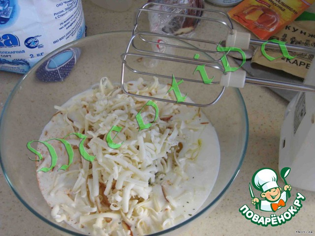 смешать масло, яйца, кефир, сыр (натертый на крупной терке), соль, специи, разрыхлитель, хорошо взбить миксером