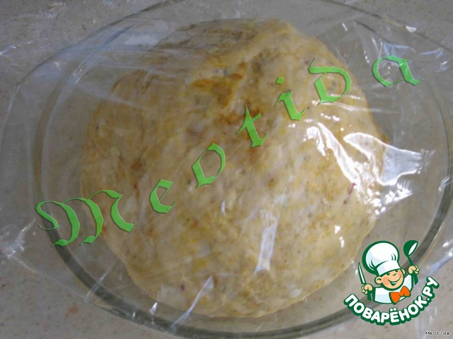 вымесить тесто с оставшейся мукой, добавив карри. Тесто должно быть гладким и не липнуть к рукам