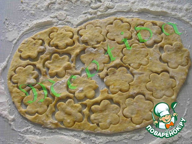 тонко раскатывать на присыпанной мукой поверхности и формочкой вырезать цветочки