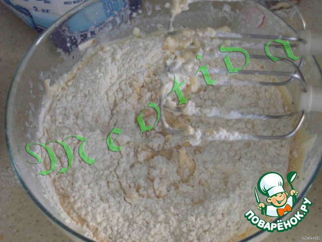 добавить стакан 1,5 стакана муки и взбить миксером на самой низкой скорости
