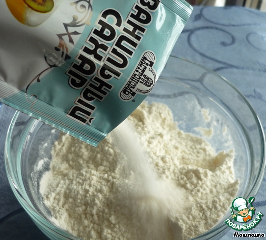 Делаем тесто: муку смешиваем с разрыхлителем, добавляем соль, всыпаем пакетик ванильного сахара, перемешиваем.