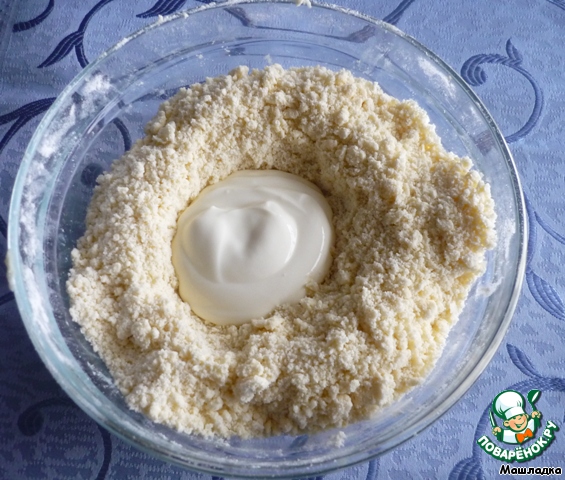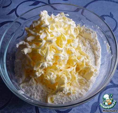 Руками замешиваем тесто до состояния мелкой крошки, т.е. пальцами втираем масло в муку.