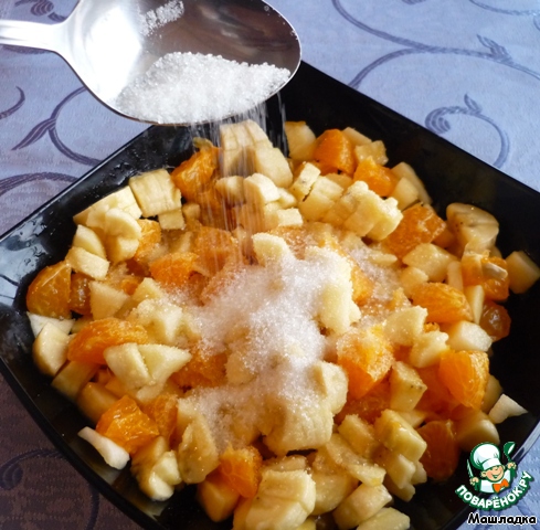 Очищенные фрукты нарезаем кубиками, посыпаем сахаром.