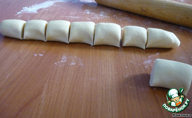 Делаем из него жгут. Делим на 8 равных частей. Одну часть отложим в сторонку, из нее мы сделаем тесёмки для мешочков.