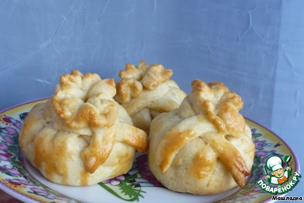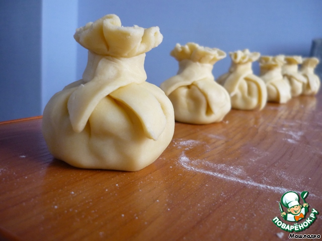 Укладываем их на противень, застеленный пергаментной бумагой. Смазываем верх мешочков желтком и отправляем в нагретую до 180 градусов духовку на 25-30 минут.