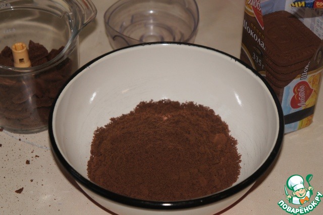 Растопить сливочное масло и оставить охлаждаться. Печенье измельчить и добавить к нему растопленное сливочное масло. Тщательно перемешать.
