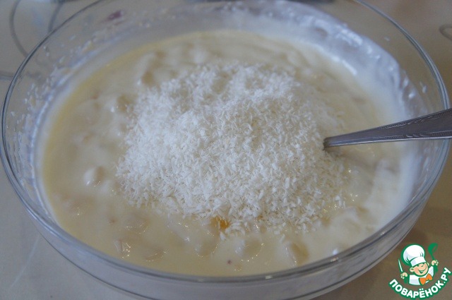 Присыпать оставшейся кокосовой стружкой. Хранить в холодильнике.