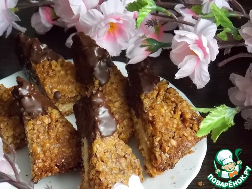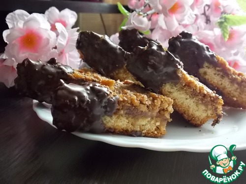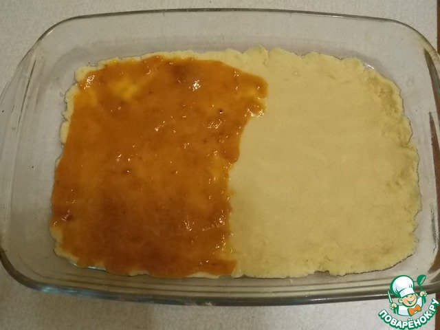 Форму 20*30 смазать растительным маслом. Ровным слоем уложить тесто на дно. Верх намазать абрикосовым джемом или вареньем, которое надо пропюрировать.