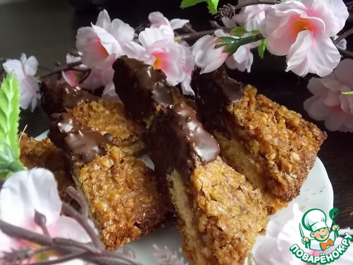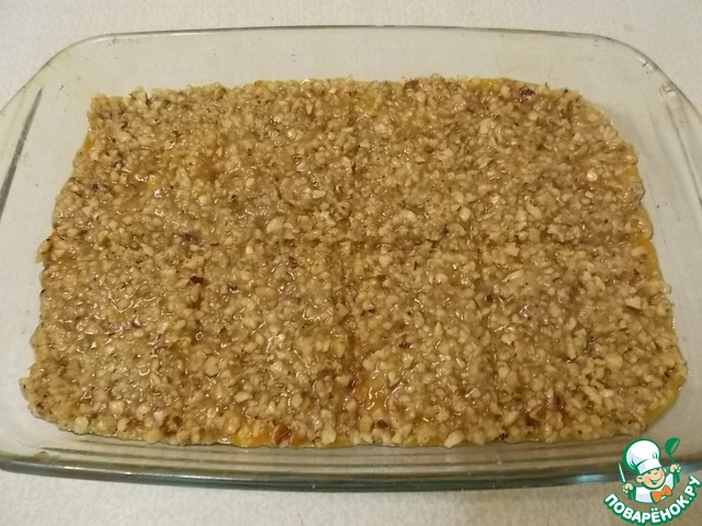 Выпекать при t=160 45 мин. Вынуть и дать полностью остыть. Не старайтесь нарезать его теплым. Слой очень нежный, и вы его просто переломаете. После того, как пласт остыл, нарезать его на квадраты, а их по диагонали на треугольники.
