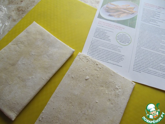 Раскатайте слоеное тесто и нарежьте на квадраты со стороной 12 см. Каждый квадрат теста смажьте размягченным сливочным маслом. Из одного листа 250 г вышло около 9 штук.