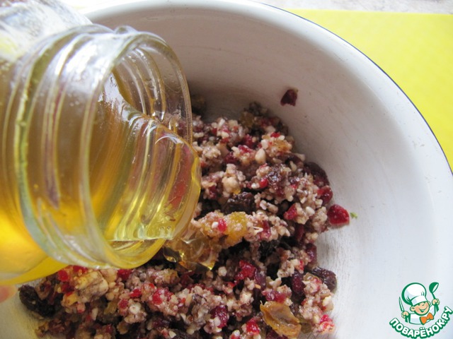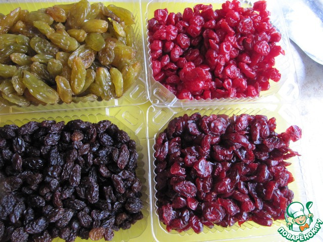Для начинки вымойте изюм светлый и темный, вяленую вишню и клюкву, обсушите. Можно брать различные имеющиеся вяленые фрукты и ягоды: курагу, чернослив, финики и экзотические.