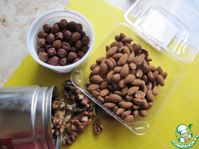 Смешайте грецкие орехи, миндаль, фундук. Слегка прокалите их на сковородке.