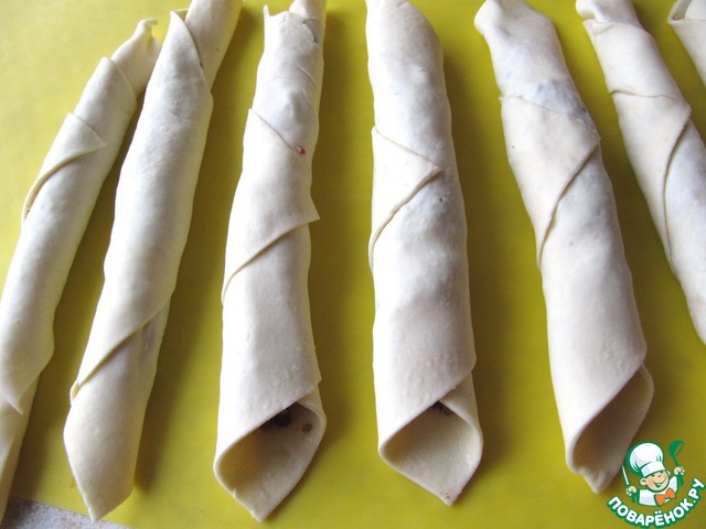 Сверните квадрат с начинкой в трубочку по диагонали, начиная с одного угла, чтобы получилась "сигара". По желанию сверху можно смазать сливочным маслом и посыпать коричневым сахаром.