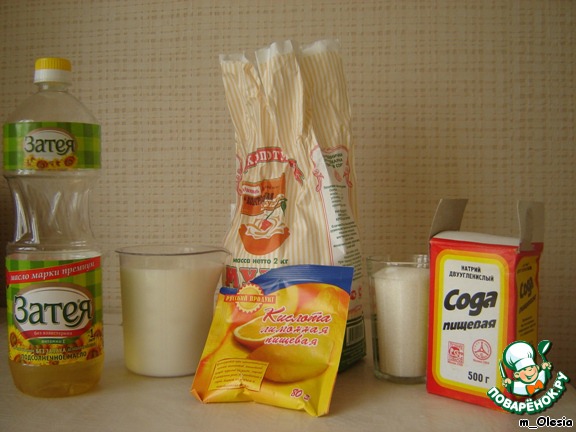 Берем 0,5 л молока, 1 стакан сахара, 100 г подсолнечного масла, 1 неполную столовую ложку соды, погашенную лимонной кислотой, муку.